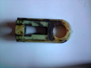 A l’époque des DS, du fait des contraintes exercées sur ces pièces, déjà le plastique cassait. A présent c’est presque toutes les DS à BVM qui rencontrent ce problème. J’ai du me dépanner en fabriquant cette pièce à la va-vite, en métal et avec un silentbloc. Ca doit bien faire 20 ans et ça marche toujours. Les pièces suivantes ont été faites avec un tour (je n’ai pas de photo). C’est juste plus joli, rien de plus. Cette pièce n’est pas refabriquée, et elle est réellement introuvable