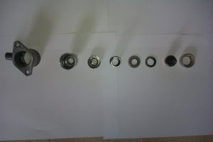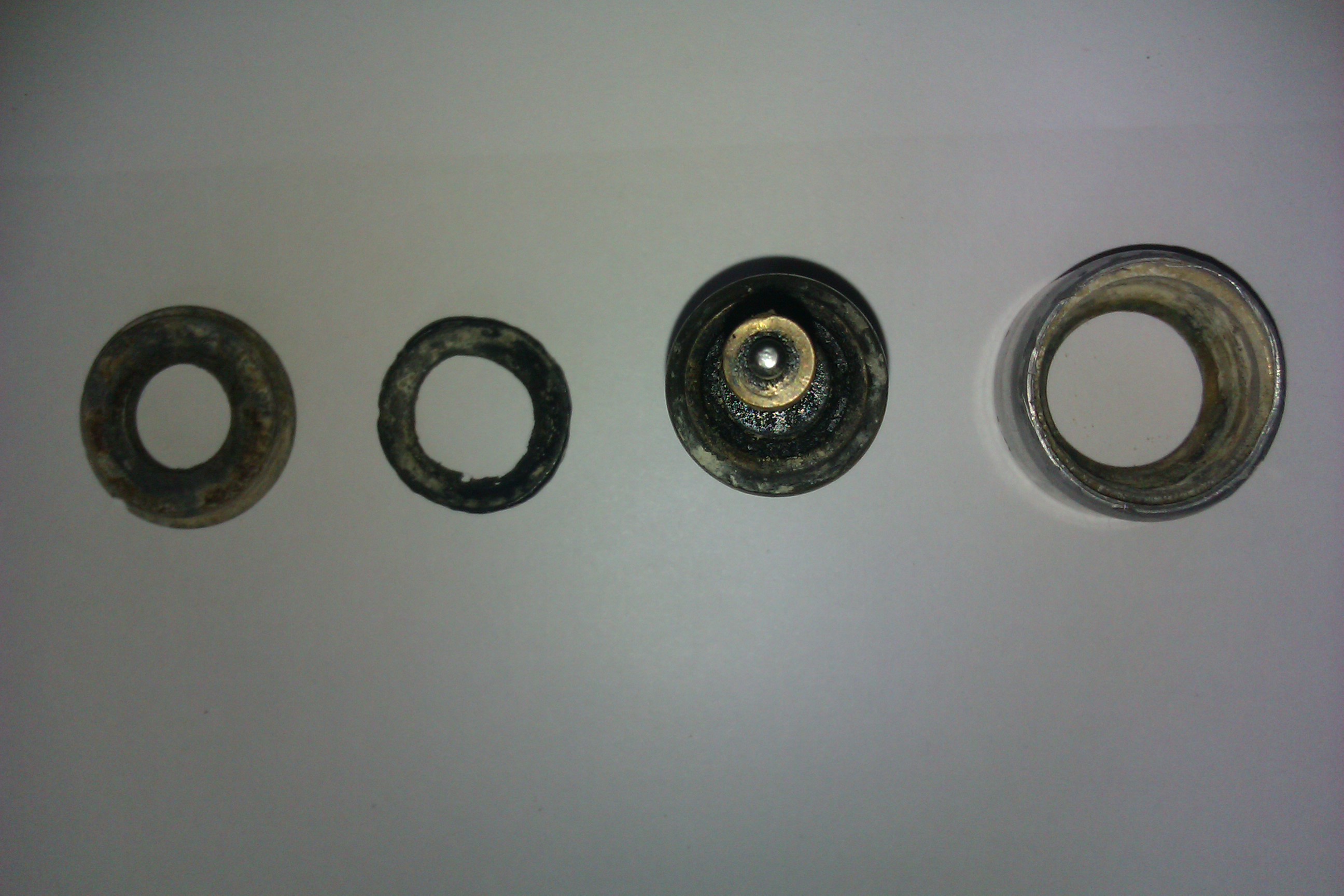 Le plus compliqué sera alors de soulever doucement l’épaulement qui retient la cartouche prisonnière pour la l’extraire de sa cage couvercle . Pour ma part j’utilise un petit tournevis plat et fin que je tapote a plusieurs reprises et de façon circulaire, jusqu’à libérer la cartouche. De gauche à droite : Couvercle, joint torique, cartouche, cage.