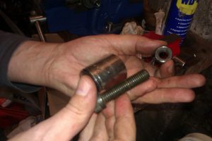 On se prépare à mettre en place le boulon (vis passant au travers de la douille et écrou en appui sur celle-ci)