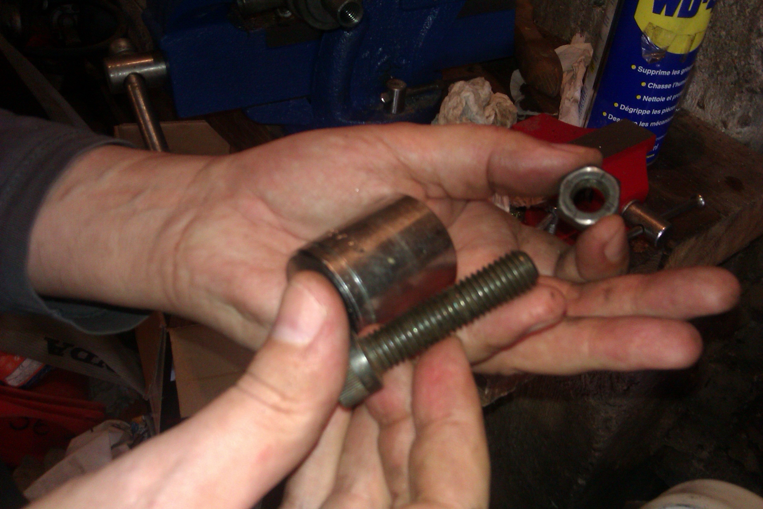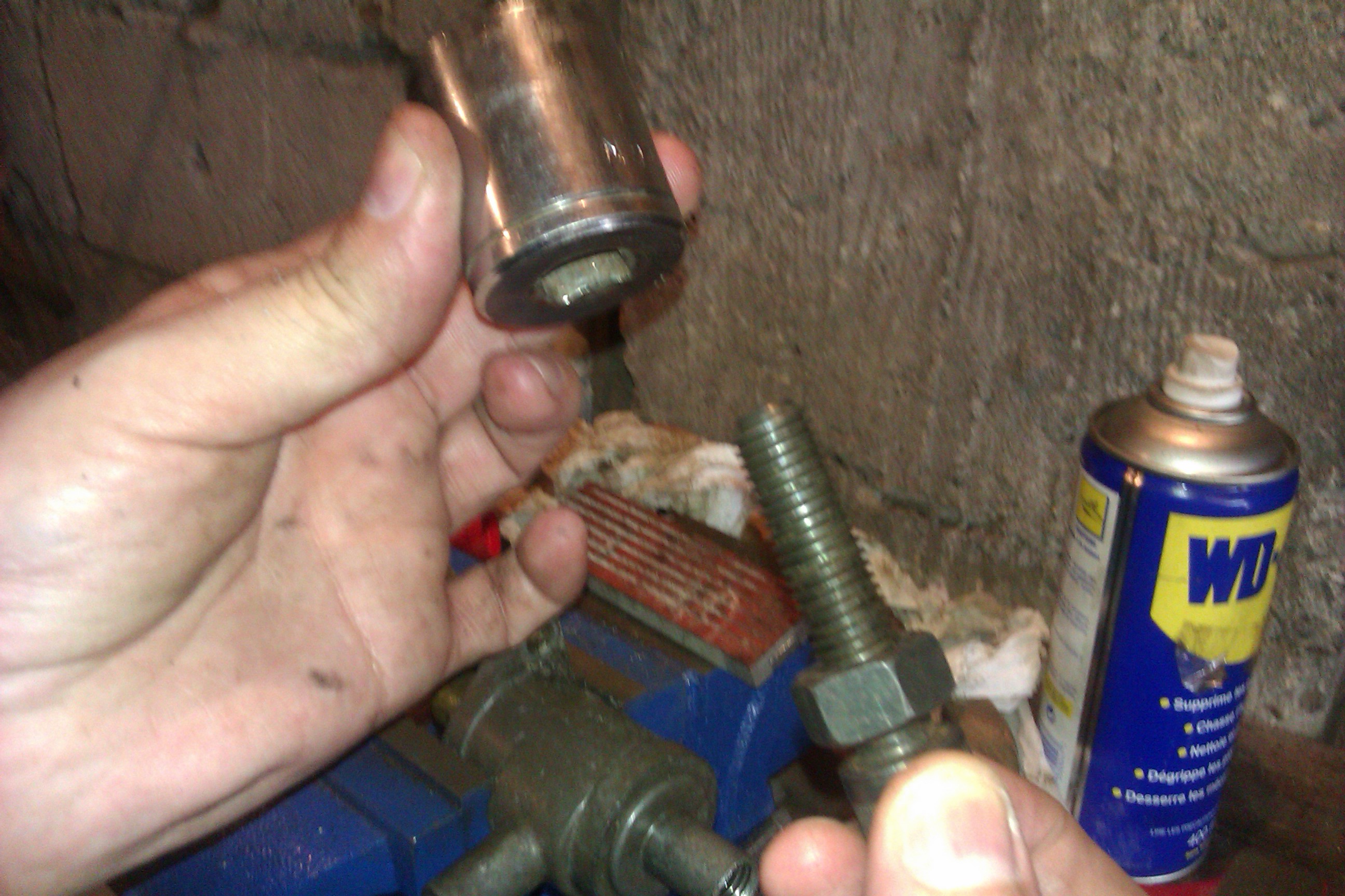 Et on prépare un extracteur maison composé d’un boulon de 12 ( vis et écrou) et d’une douille de 27