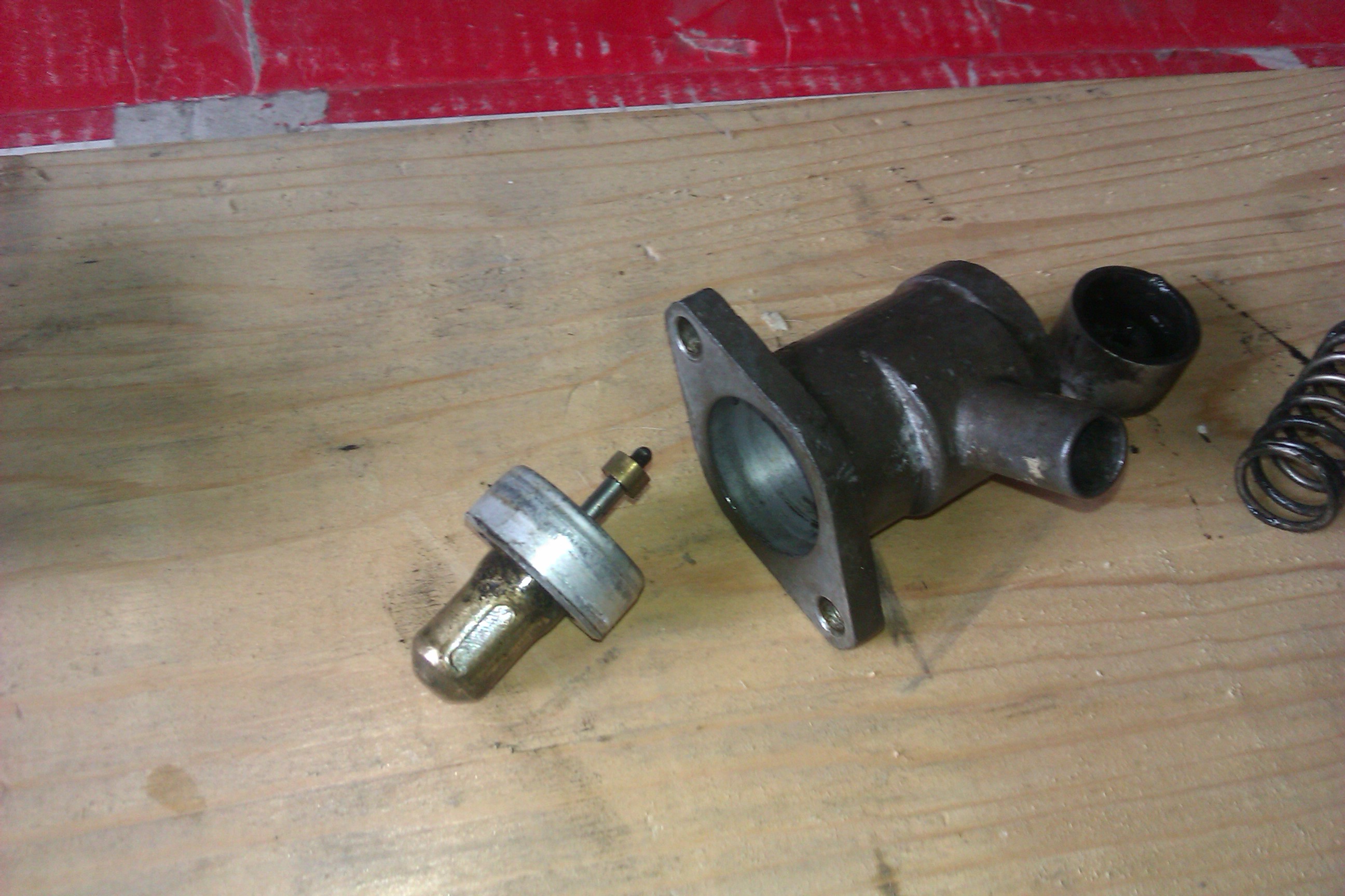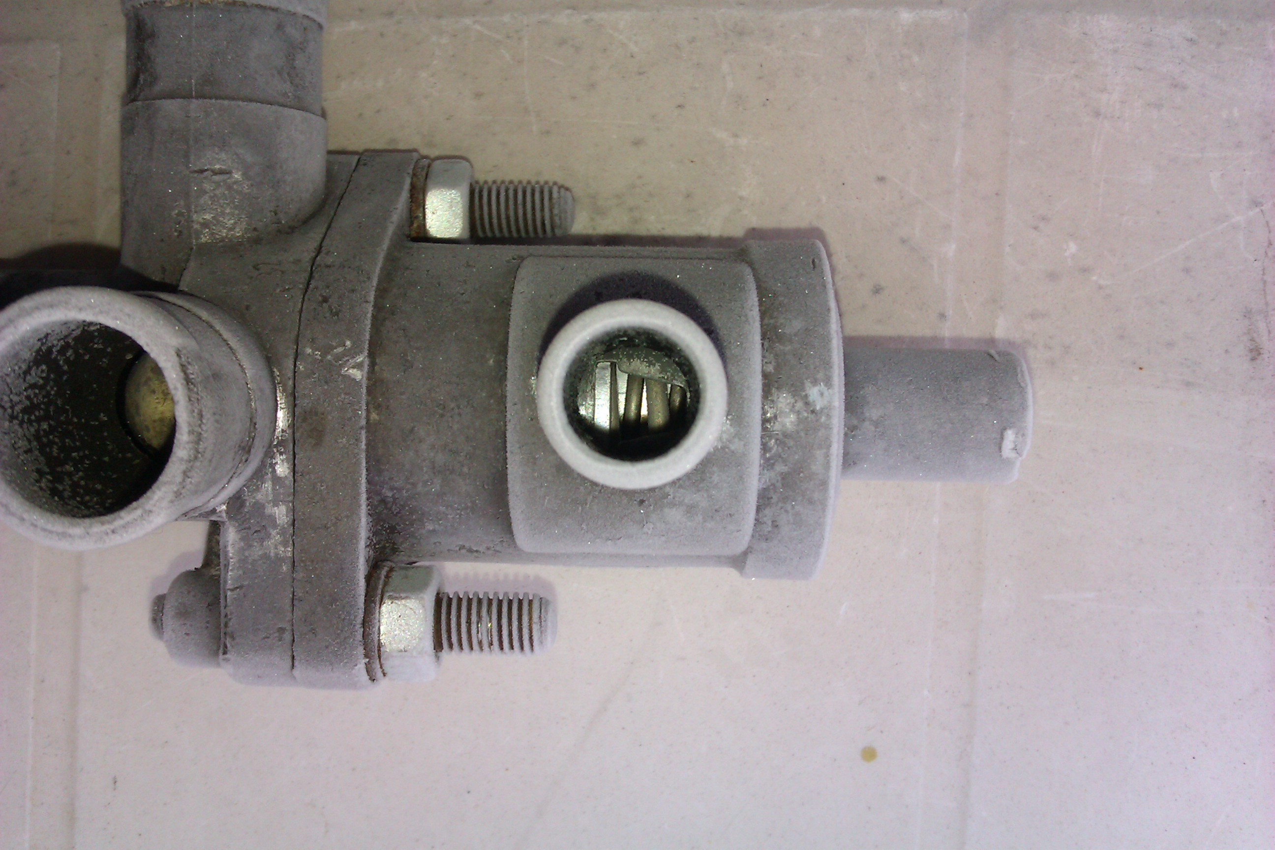 Une vue sur la cartouche de cire qui baigne en temps normal dans le liquide de refroidissement, on remarque la couleur verdâtre prise par le cuivre qui n’a pas pris un bain de liquide de refroidissement depuis belle lurette.