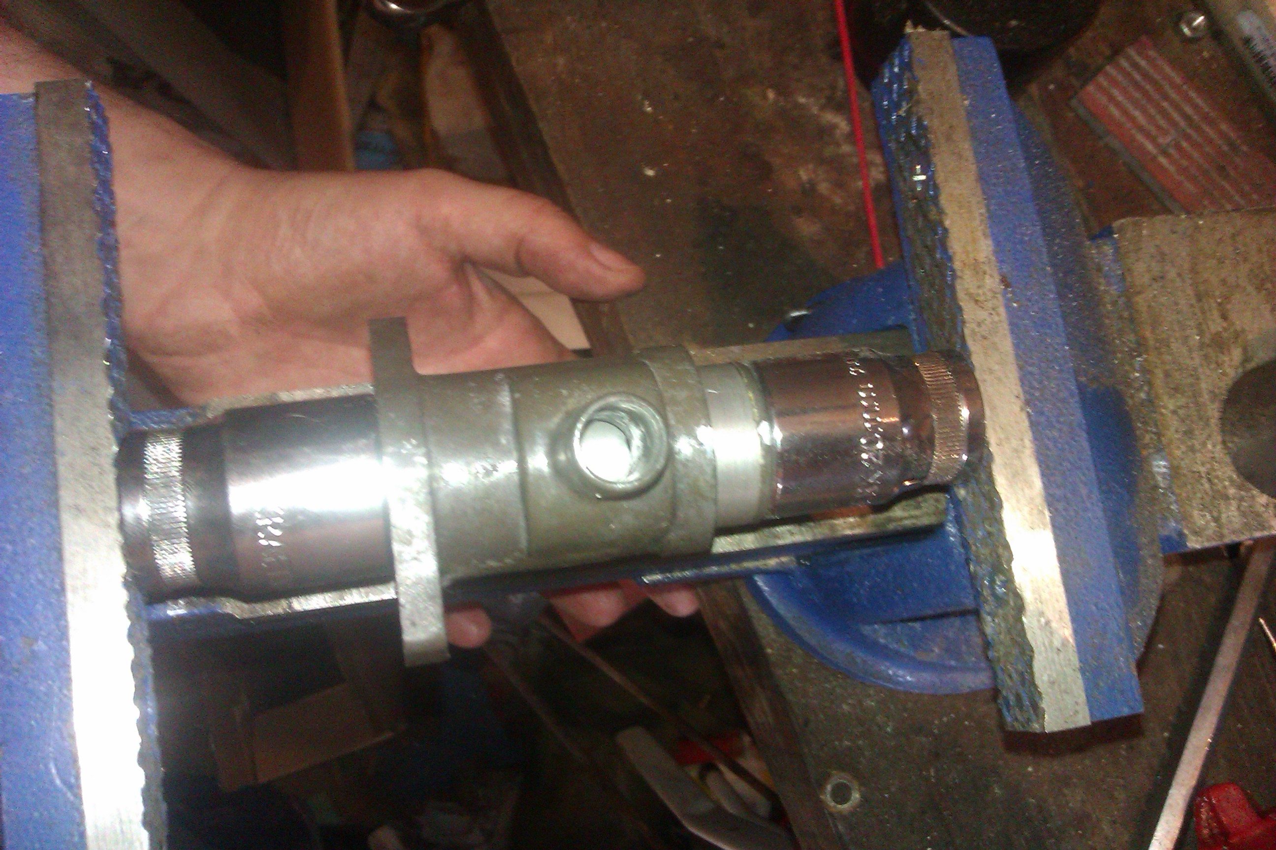 Une douille pour maintenir le corps, l’autre pour entrer l’ensemble chemise piston ressort dans le corps, il n’y a plus qu’à serrer l’étau et c’est réassemblé.