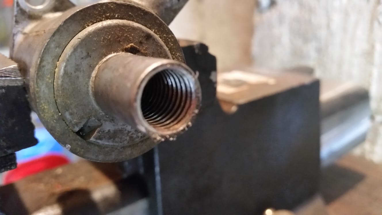 Le filetage terminé. A noter le repérage de la chemise par un trait de scie face à l’encoche.